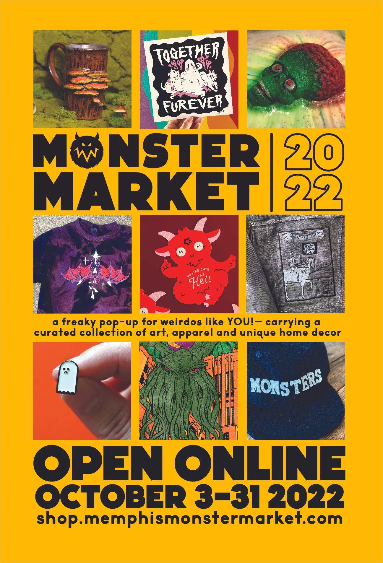 Monster Market is an annual curated pop-up retail experience curated by me, Holtermonster. I carry a juried selection of art, apparel and novelties from weirdo makers, artists, designers, and small brands all over the country. The pop-up appears somewhere new in Memphis, TN each year and is open only for the month of October. Over the years we’ve been an in-person shop, an online store, and in 2022, we had our first hybrid year, with an in-person event to kick-off the virtual season.